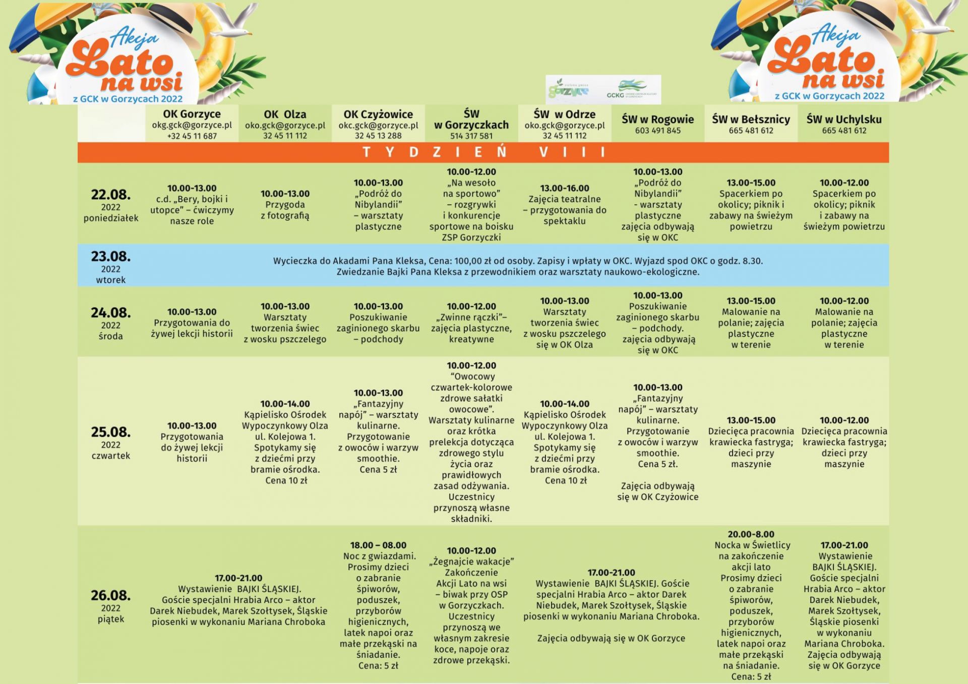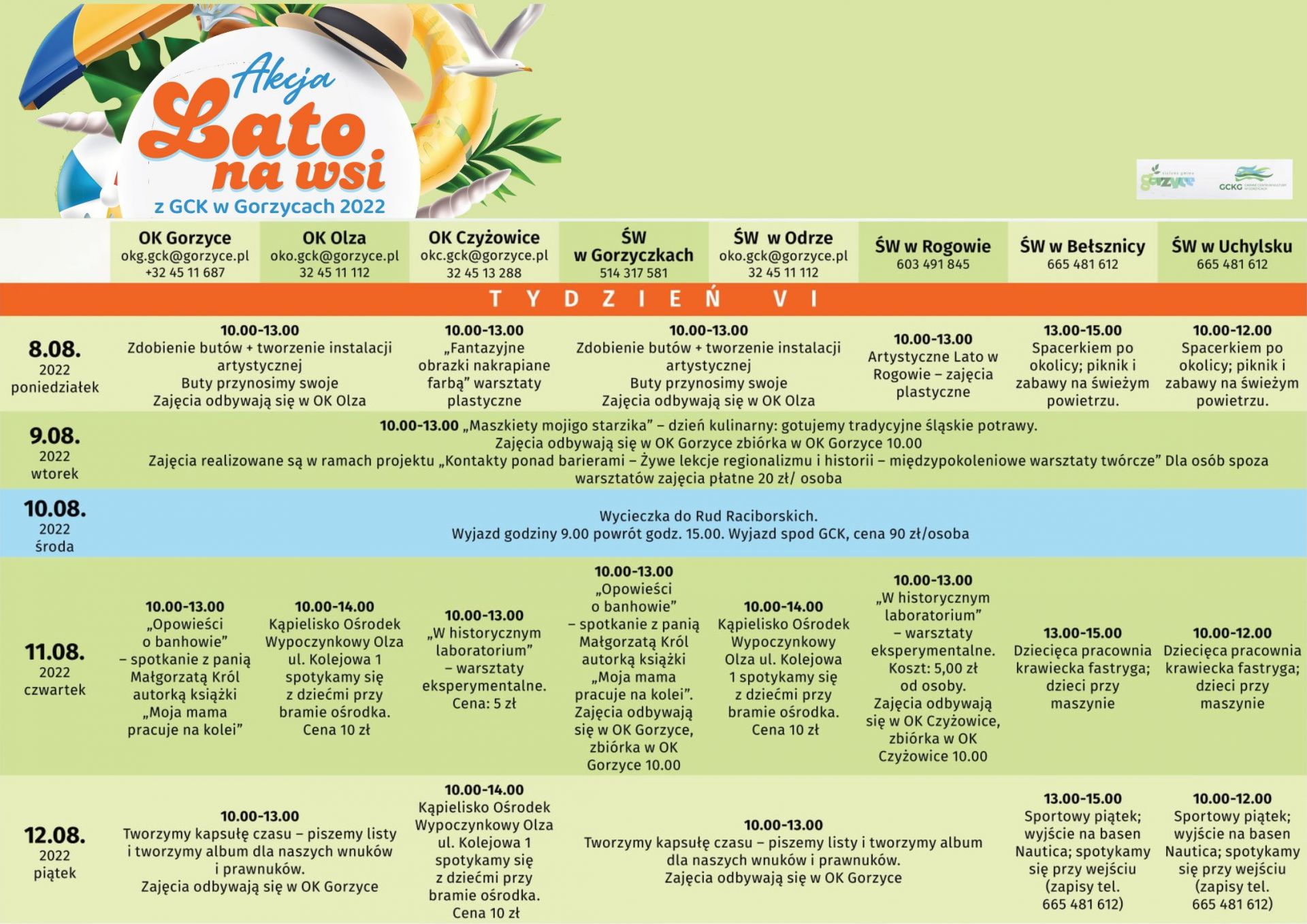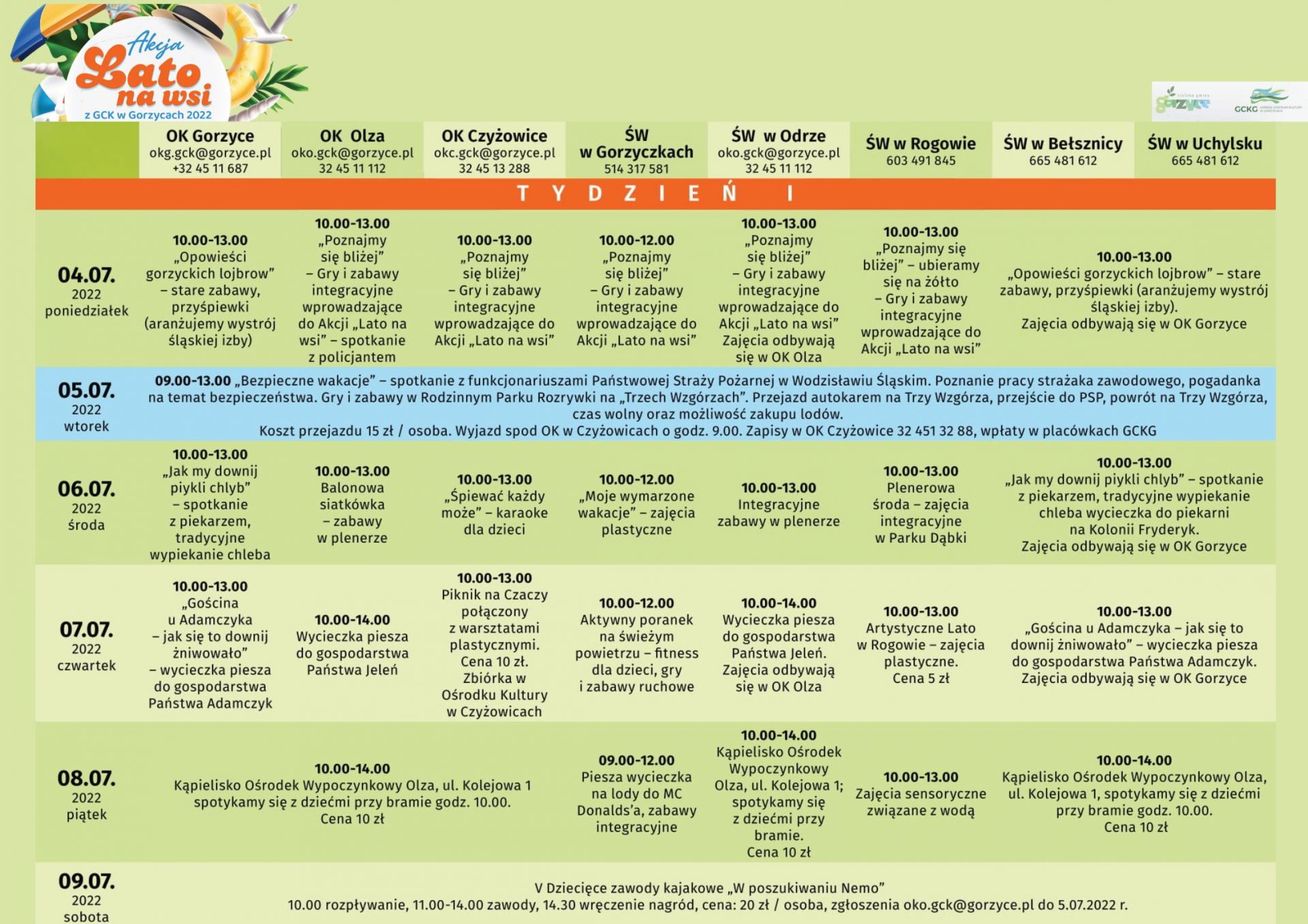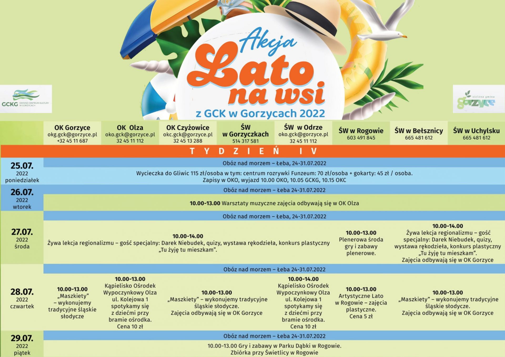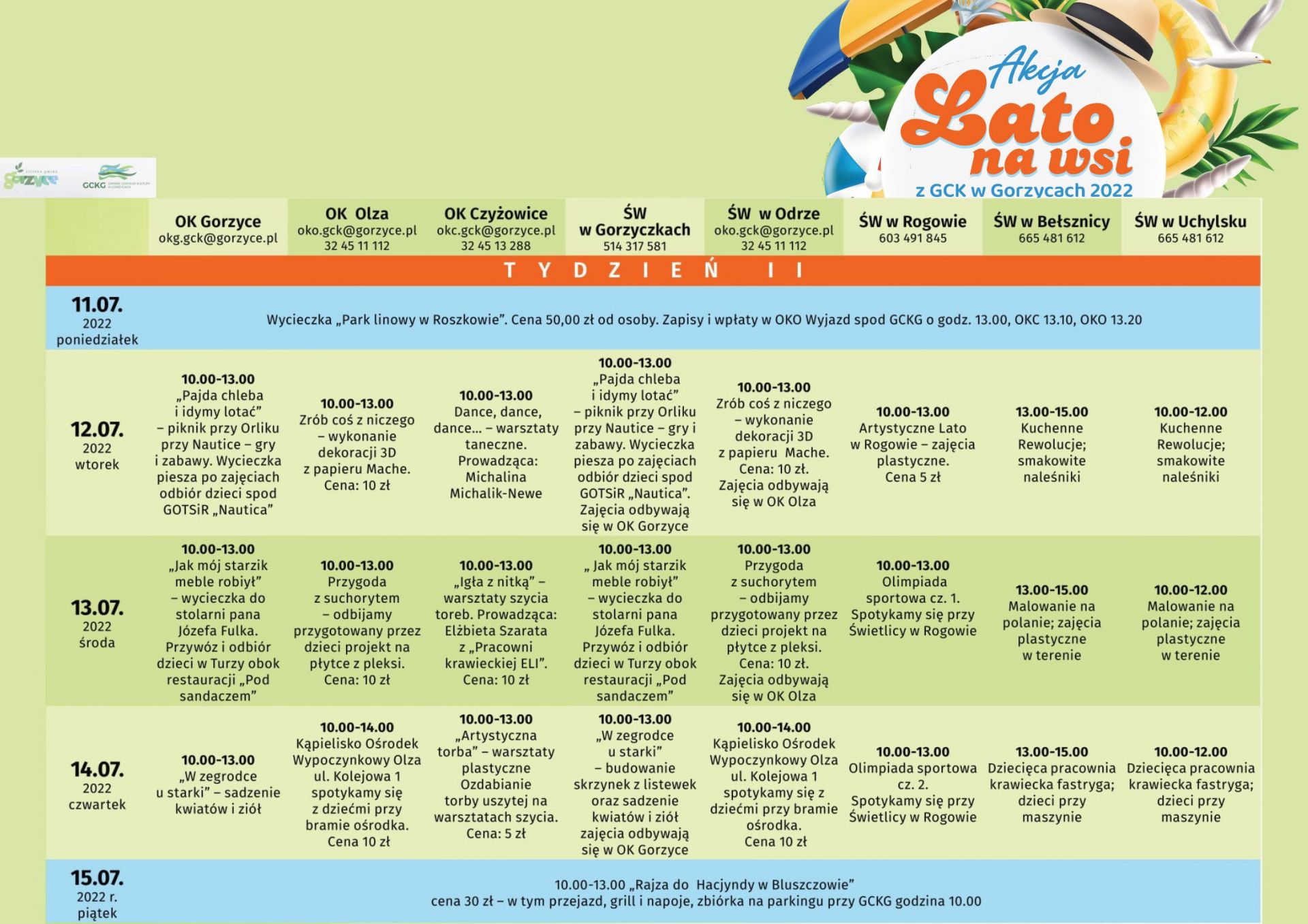 Ogólny rozkład zajęć, imprez, wyjazdów akcji LATO NA WSI, dostępne są w załącznikach poniżej.