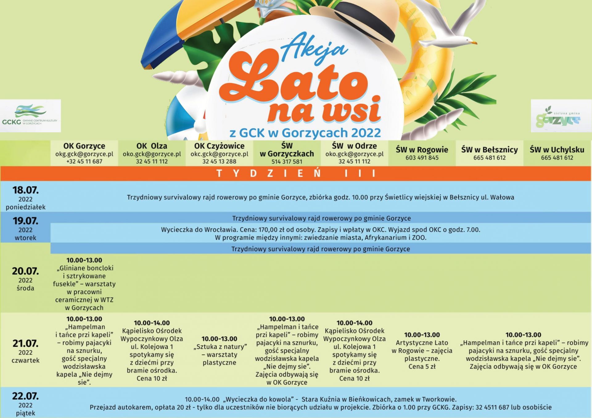 Serdecznie zapraszamy do zapoznania się z tegoroczną ofertą placówek Gminnego Centrum Kultury w Gorzycach jakie zostały przygotowane na okres lipiec/sierpień 2022 r. Jak co roku pracownicy i prowadzący warsztaty przygotowali bogatą ofertę zajęć, wyjazdów dla dzieci i młodzieży pozostających na wsi.